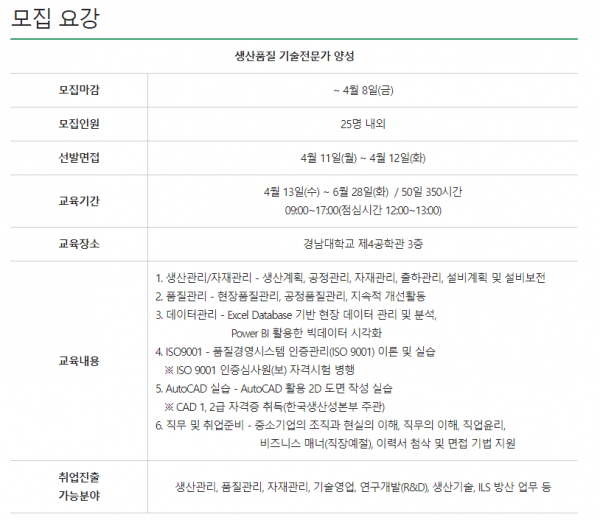 경남대학교 생산품질관리 전문가양성 국비무료 교육생 모집