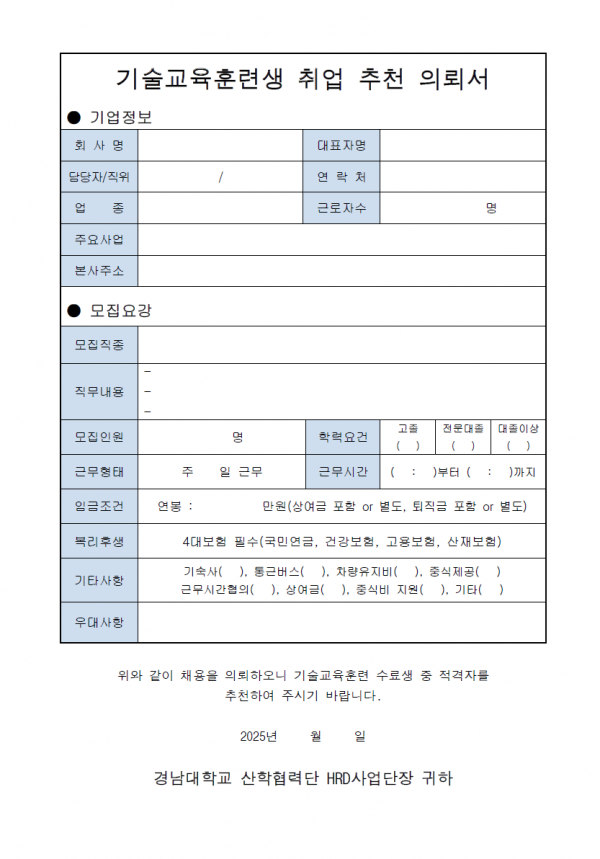 - 다음글중소, 중견기업 생산품질인재 채용을 위한 기술교육훈련 수료생 채용 연계 건 25.07.01